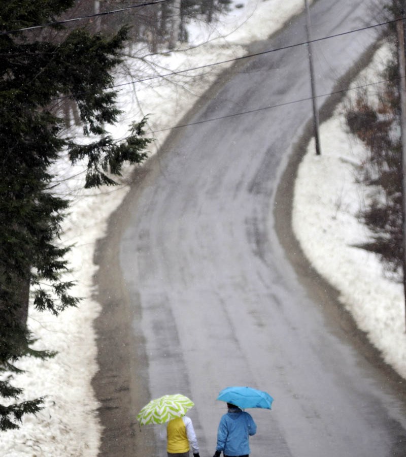 Janet Smith, right, of Winthrop, walks with her friend, Juanita Dunn, of Manchester, through a mixture of snow and rain Monday in Manchester. Rain is expected to persist Tuesday with a chance of snow this weekend.