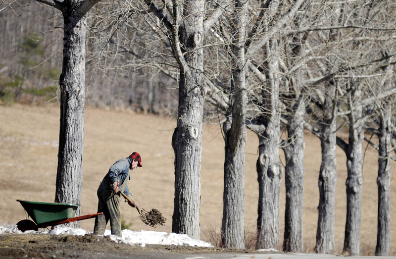 Nerf Sabatine dumps sand he raked up in front of his Whitefield farm Wednesday. Sabatine devoted the morning to cleaning up the sand remnants of a “long, snowy winter,” he said.