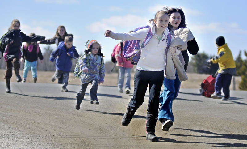 Children run across the South Monmouth Road after getting dropped off by a school bus this week in Monmouth. The kids were running to Countryside Daycare, at the Jessica and Scott Herr residence, to