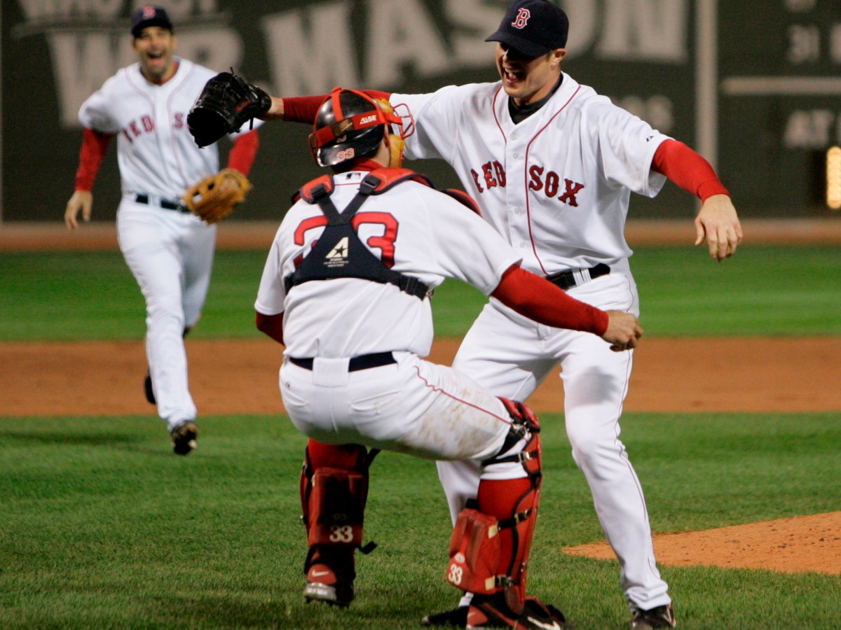 The former pitchers, who are in Maine for the annual golf tournament, give a lot of credit to catcher Jason Varitek for their historic accomplishments at Fenway Park.
