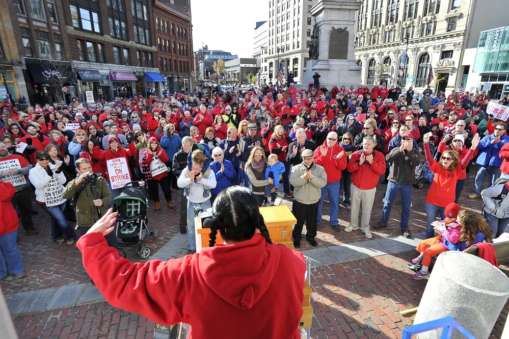Hundreds of strikers, standing elbow to elbow and dressed in red and black, fill half of Monument Square before marching to FairPoint’s offices on Forest Avenue.