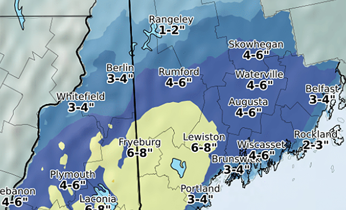 The National Weather Service is issuing winter storm warnings for towns in Androscoggin, Franklin and Oxford counties. Here are the details: TIMING: Monday 7 p.m. through 6 a.m. Tuesday with the heaviest snow coming Monday evening. PRECIPITATION TYPE: Heavy snow but it could turn to rain along the Maine coast. AMOUNT: Six to 8 inches […]