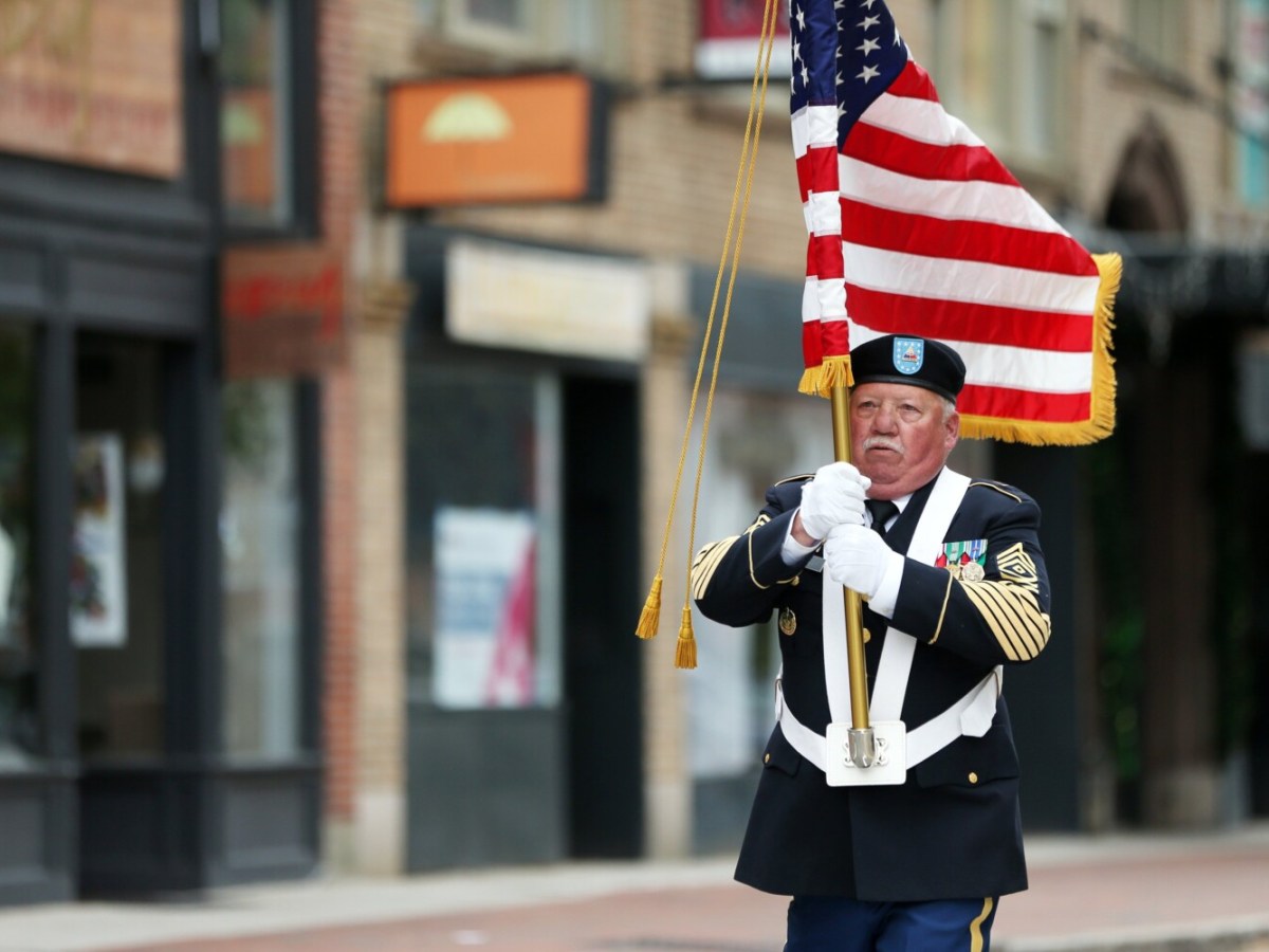 To a smattering of applause from a few dozen onlookers, retired Army 1st Sgt. Richard Cobb briskly marches from Longfellow Square to Monument Square.