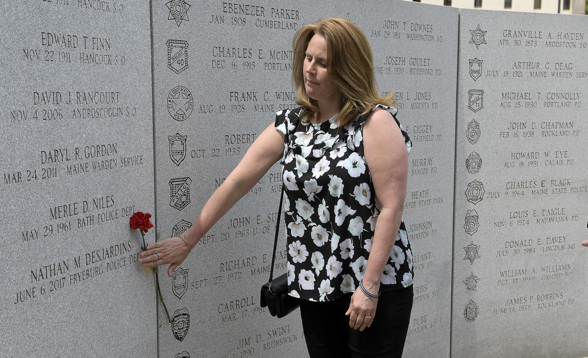 The name of a Fryeburg officer who died last summer, Nathan M. Desjardins, was added to a wall memorializing those killed in line of duty.