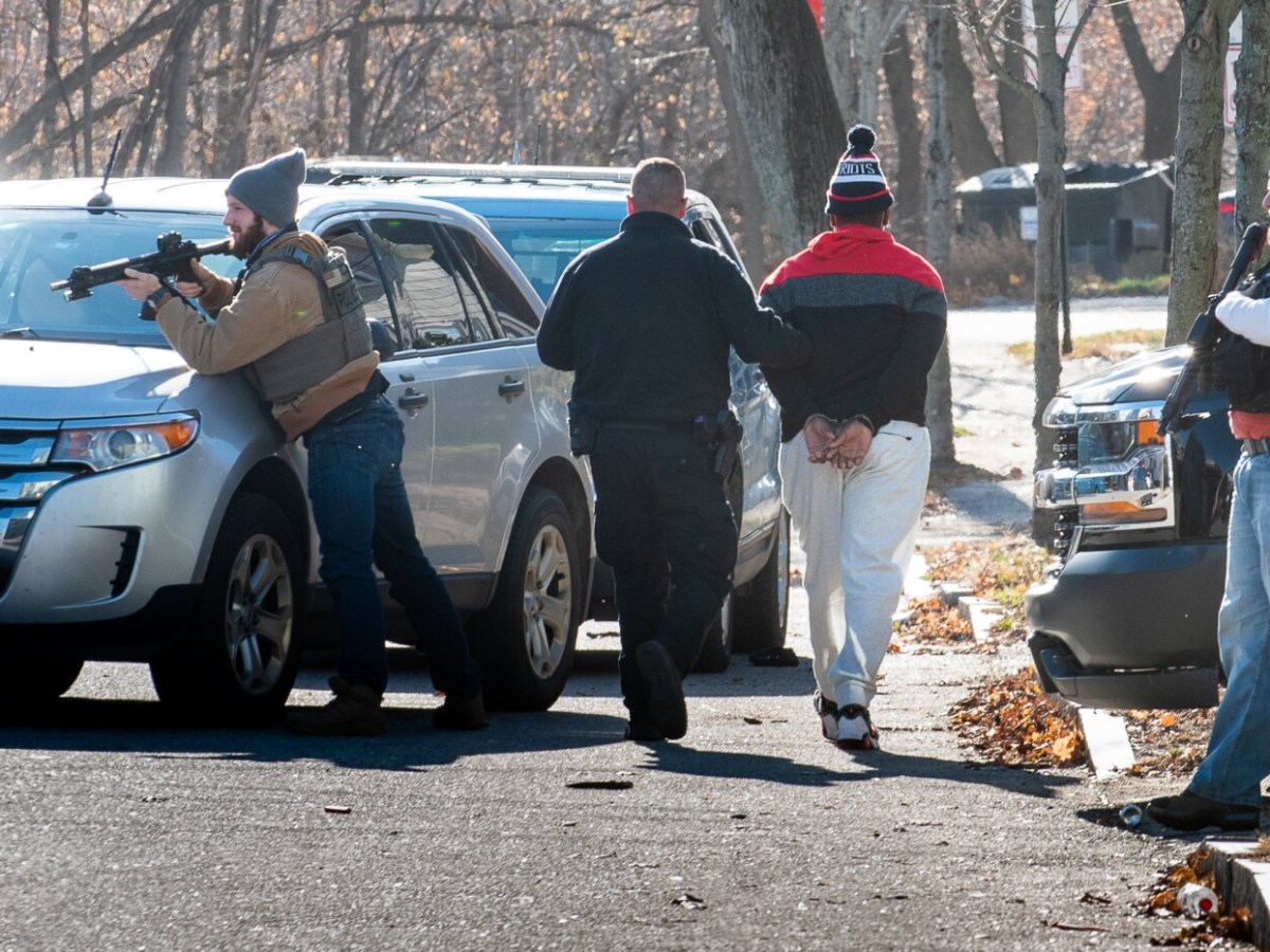 Police officers and a suspect exchanged gunfire around 4:30 a.m. Later, they surrounded a Horton Street apartment building for about four hours, arresting two men in the afternoon.