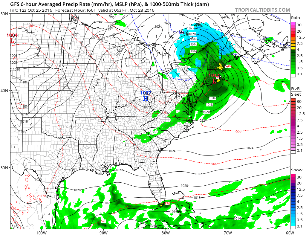 A coastal low pressure system will bring rain, heavy at times this afternoon and evening.