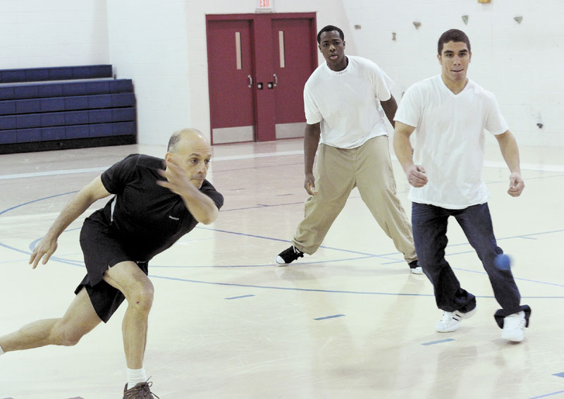 SOUTH PORTLAND — In the gymasium at the Long Creek Youth Development Center, a 15-year-old boy in tan pants and a white T-shirt dives to the floor, swatting a small blue handball off the back wall as other players shout cries of approval.