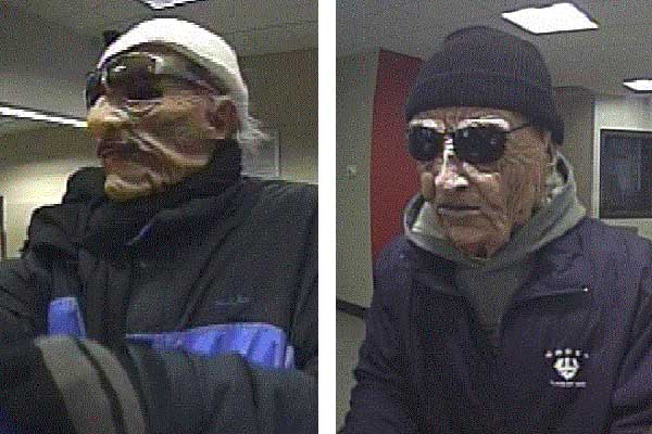 The same two people, wearing masks made to look like old men, were last seen getting into a car on Brook Road.