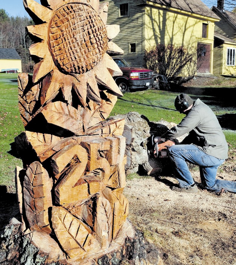 Eric Ogden cuts up sections of a maple tree left over after sculptor Pasco Grove carved the trunk into a large sunflower and street number at Ogden’s home in Winslow on Sunday.