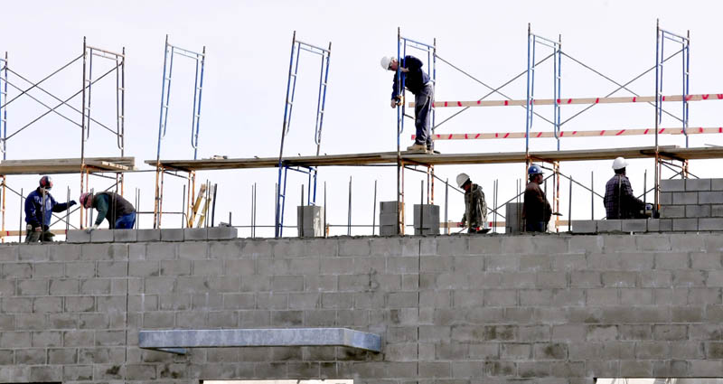Workers lay cement blocks on the ongoing expansion projects at Mt. Blue High School in Farmington on Wednesday.