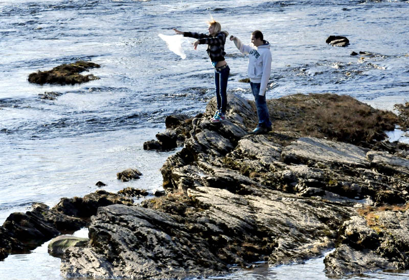 Kerri Stone, left, and Drew Gammon throw pieces of ice that formed on Sandy River in Farmington Falls on a chilly Wednesday.