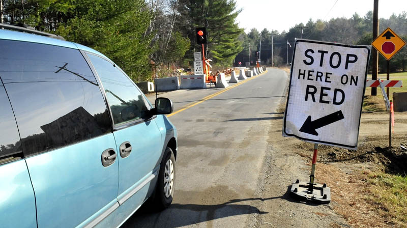 A motorist stops and waits for the signal to proceed along a portion of the Whittier Road in Farmington on Wednesday. The road has been closed due to erosion near the Sandy River, but this week officials reopened one lane to traffic.