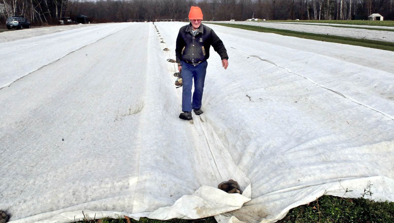 David Pike places stone weights on a large winter cover that protects strawberry plants at his farm in Farmington on Wednesday. Pike said the straw he once used as protection was costly and blew off in the wind.