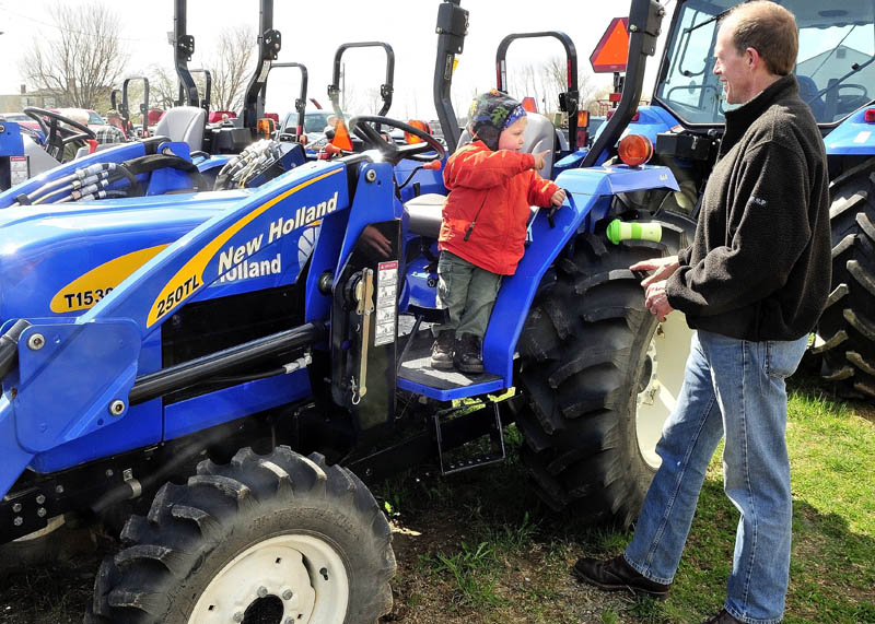 Ryker Olson points out the next tractor he wants to sit on to his father, David, during the 52nd anniversary open house at Ingraham Equipment company in Knox on Wednesday. More than 600 people toured the business that sells equipment for farming and gardening. The event also had free breakfast and lunch.