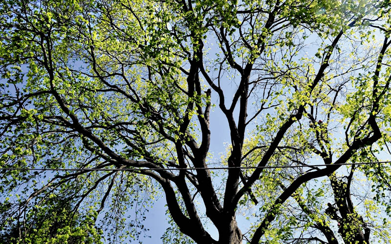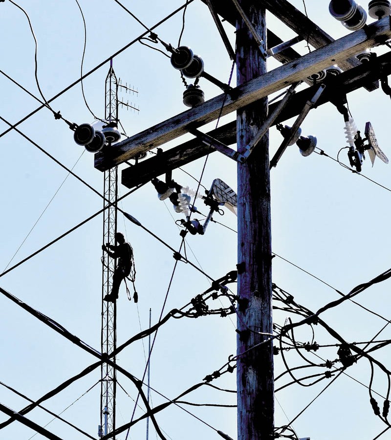 HIGH WIRE: Brian Trayhan of Yankee Communications is seen through utility wires as he descends from a tower 80-feet above the ground on the Somerset County Superior Courthouse in Skowhegan on Monday. The Benton company is installing equipment for wireless radio connections between town municipal buildings.