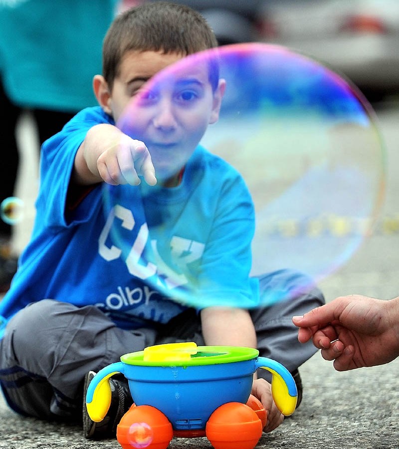Vassalboro Community School student Mathew Klepser, 8, points to a giant bubble at the Colby Cares barbecue at the college on Thursday.