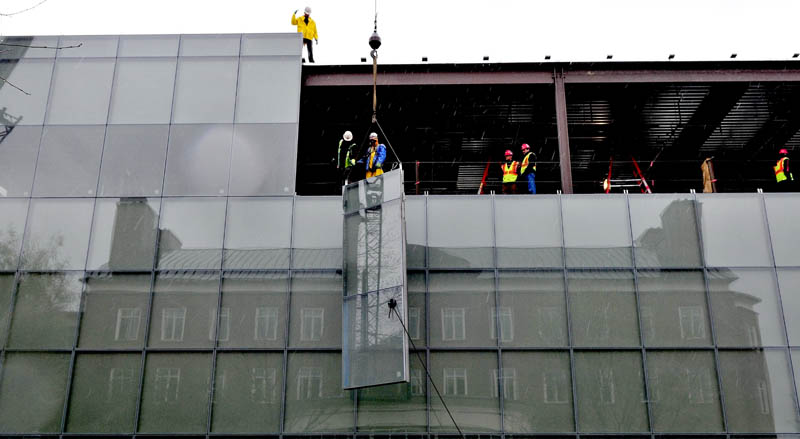 Colby College’s Olin Science building is reflected in a wall of glass panes as workers use a crane to install one on the outside of the art museum expansion project on Tuesday.