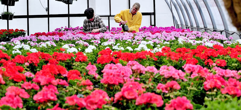 Though it was cold and rainy outside Bernice Guerin, left, and Gayle Labreque stayed comfortable plucking wilted petals off geraniums growing inside a warm greenhouse at Hilltop Farm in Fairfield on a wet Tuesday. The company sells flowers and vegetable seedlings.