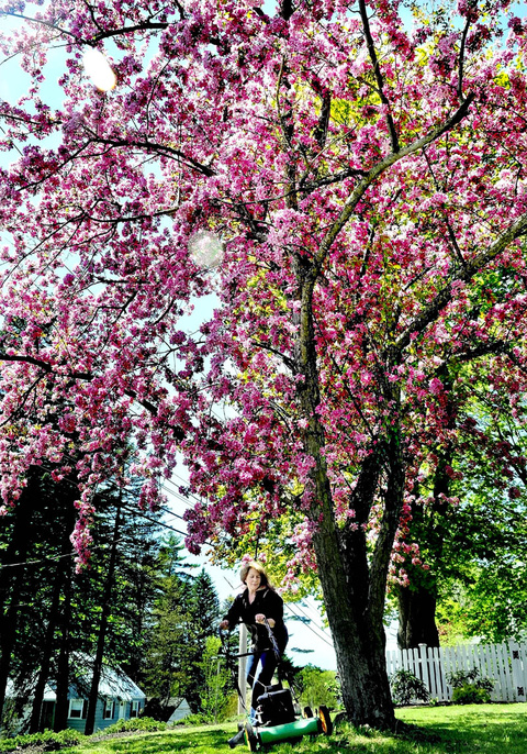 Debbie Palmer mows the lawn under a colorful flowering cherry tree on Burleigh Street in Waterville on Monday.