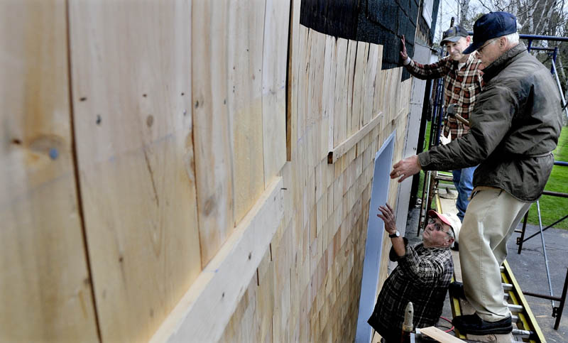 The Tim Giroux residence in Vassalboro got a facelift with new cedar shingle siding on Wednesday. Giroux, right, works with John McLean, on ground, and Bruce Noel on the 1840s home.