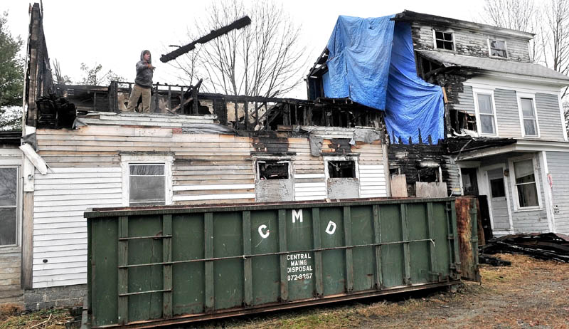 Justin Smith throws burned lumber off the second floor of a home on Weston Avenue in Madison on Wednesday. The house sustained serious damage in an arson fire set Nov. 30, 2010. Co-owner Alan Ward said the house will be rebuilt after salvage work is complete and will be smaller. Ward did not know when the house will be finished.