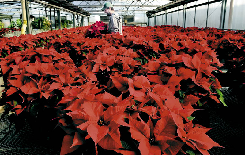 Harlan Benner carries a poinsettia plant through rows of flowers Wednesday at Sunset Flowerland in Fairfield Center. Benner said the greenhouse grew 6,700 plants and 15 varieties of poinsettias this season.