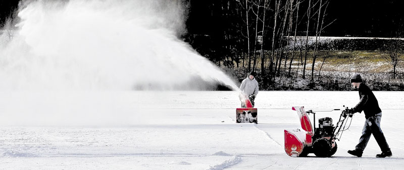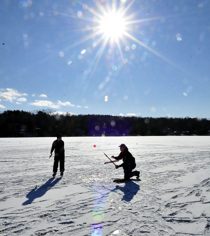 Rob Liberty of Fairfield checks one of his ice traps as his son, Connor, skates to him holding a fish he caught Sunday on Messalonskee Lake in Oakland. Rob Liberty said the ice was nearly five inches deep. “This (fishing) beats sitting on the couch,” he said.