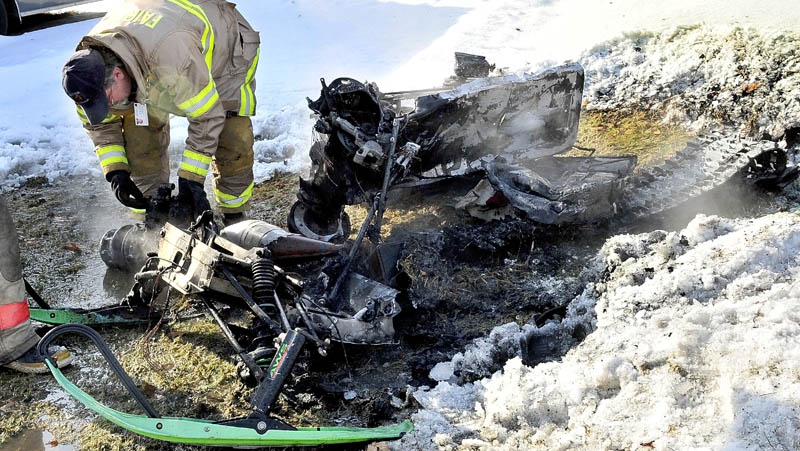 Firefighter Jim Lane examines the smoking remains of a snowmobile that burned in Fairfield on Thursday. Owner Justin Bouchard said he had done some recent work on head gaskets on the Arctic Cat and took it out for a ride. “It started up real easy and while I was running it, I saw smoke and flames and jumped off,” Bouchard said.