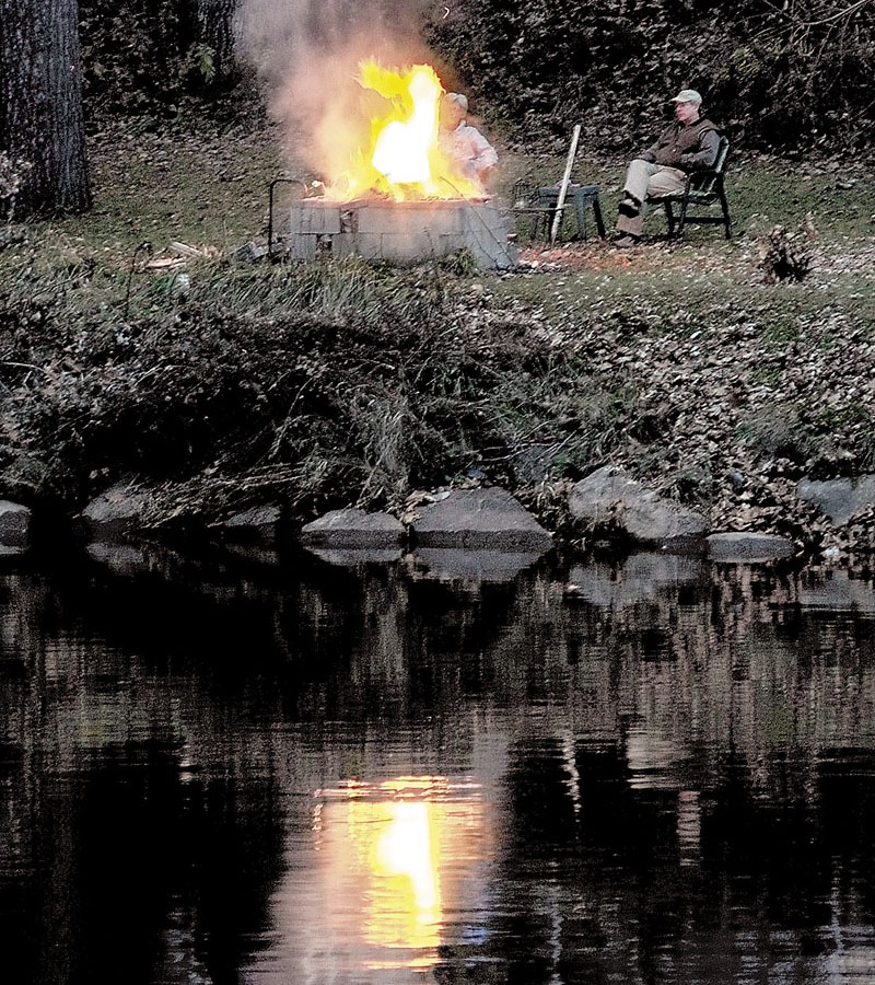 Norma Larsson, behind the flames, and Robert Sezak watch as fire consumes pine cones and brush they gathered off the lawn at their Bunker Island home Sunday night on the Kennebec River in Fairfield.