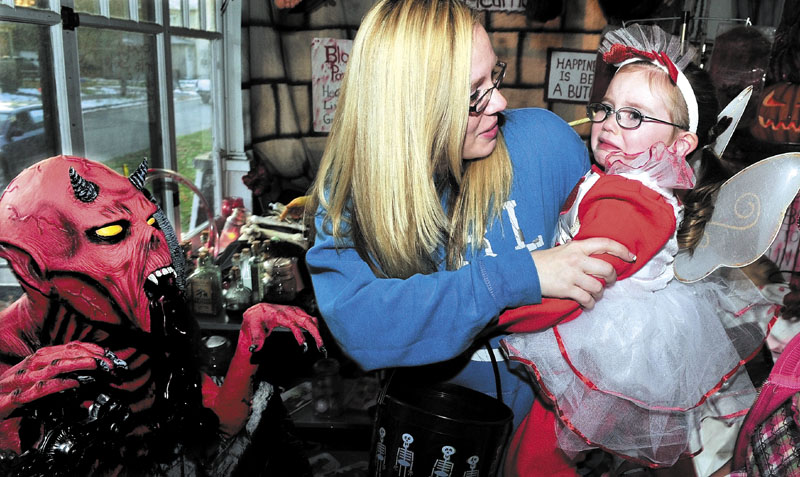 Chrissy Marson holds her frightened daughter Dakotah who cried at the sight of a devilish character at the Jeff and Melissa Giguere residence on Oakland Street in Waterville on Monday night. This is the 11th year the family has spooked up to 1,000 trick-or-treaters.