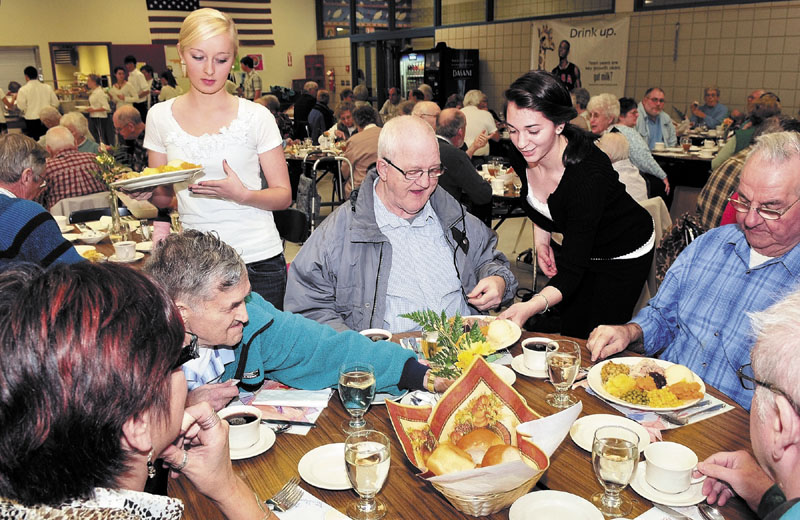 Madison Area Memorial High School students Whitney Lloyd, left, and Kristen Bishop serve dinners to clients of the Sebasticook Residential Care Center during the 22nd annual Senior Citizens Thanksgiving dinner on Tuesday evening at the school. More than 300 dinners were served and 100 more delivered to area residents as Thanksgiving fast approaches.