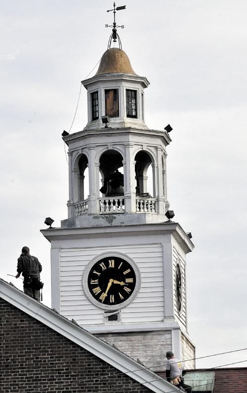 Two men work on the roof below the bell tower on the Prescott Memorial building on the Good Will-Hinckley campus on Monday.