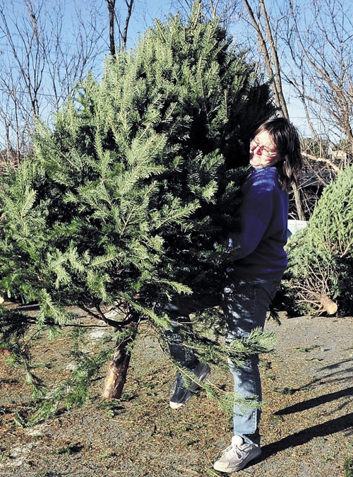 Anne Cole jams a Christmas tree to the ground to fluff out the branches while setting up at her stand at Pleau’s Market in Winslow this week. Cole said she is open daily from 7 a.m. to 9 p.m. and sells trees, wreaths and kissing balls.