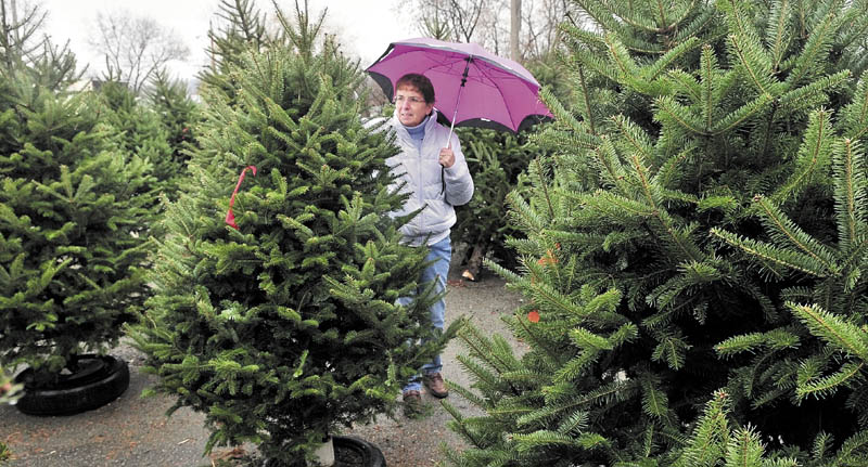 Terri Webber, of Benton, walks with an umbrella Tuesday while choosing a Christmas along Waterville’s College Avenue.