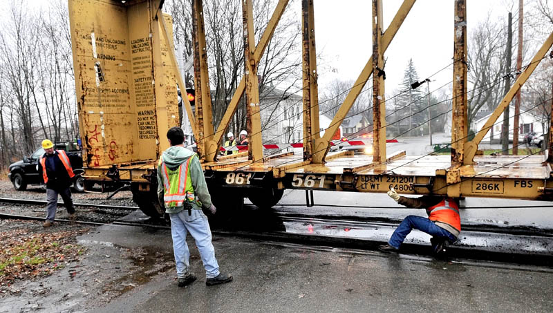 Workers with PanAm Railways use wedges to reset an empty lumber car that derailed at the Burrill Street crossing in Fairfield on Tuesday.