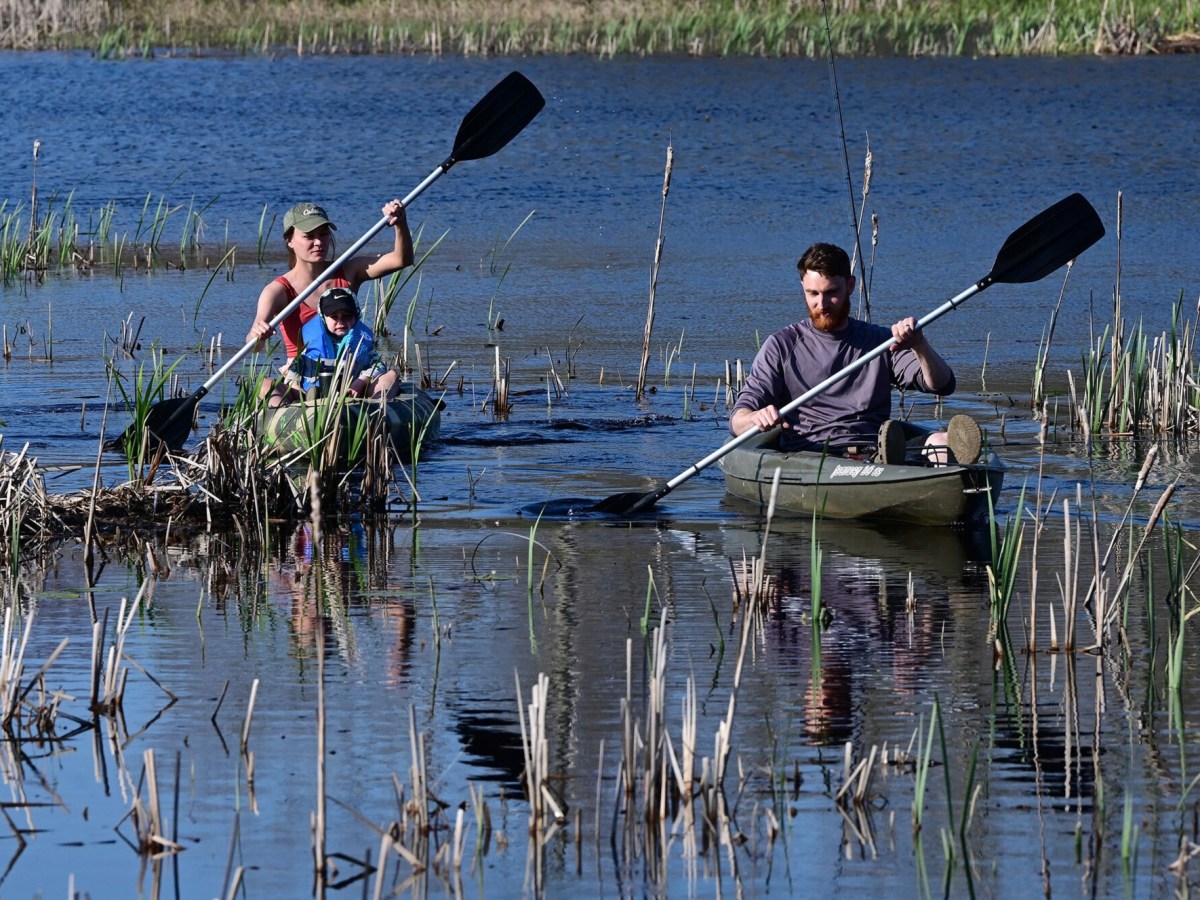 A 1-year-old joined his parents for kayaking and fishing along Hunter Brook recently, with an eye toward snagging some largemouth bass. All photos by Morning Sentinel photographer Rich Abrahamson.