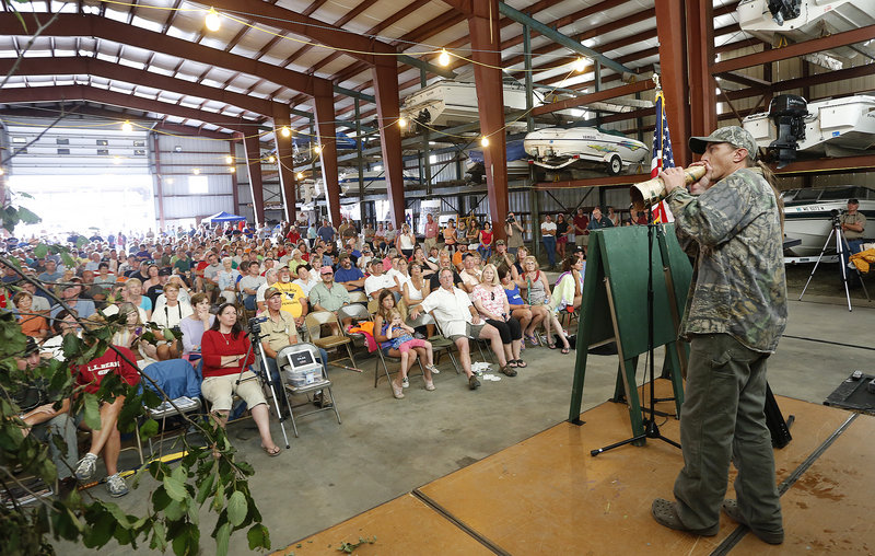 OQUOSSOC — Six competitors in the first World Championship Moose Calling Invitational did their best moose impressions for more than 700 people who crammed inside a hangar at Oquossoc Marine on Saturday.