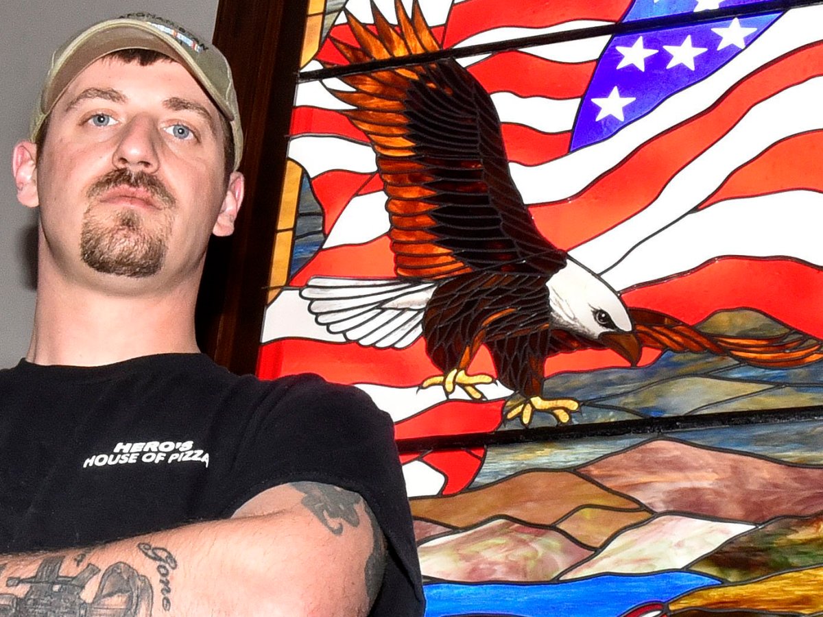 During a 16-month deployment in Iraq, Derek DeFelice, 34, was struck 28 times by roadside bombs and was awarded the Purple Heart. In September 2018 he bought Angelo’s Pizzeria and has re-branded it Hero’s House of Pizza.