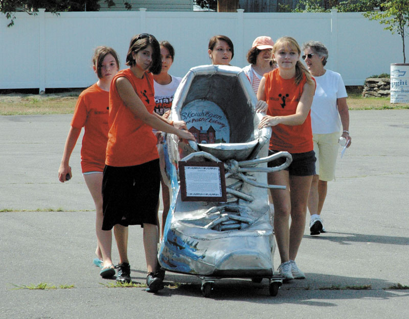 SKOWHEGAN — The Skowhegan Free Public Library had no trouble “moving more kids” Tuesday morning as five members of the high school cheerleading squad rolled a 6 foot high, 70-pound metal sculpture up Madison Avenue to the state fairgrounds.