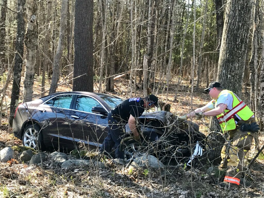 Hydraulic extrication tool similar to the Jaws of Life used to free one occupant in accident on U.S. Route 2.