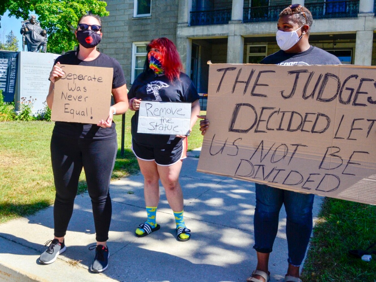Protesters argue “separation was never equal” while gathering at the statue of a Maine man instrumental in passing Plessy v. Ferguson decision.