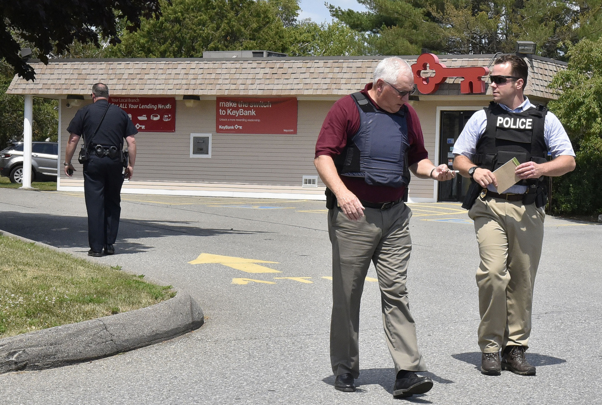 Police converged on the KeyBank offices on Kennedy Memorial Drive in Waterville after the 11 a.m. robbery report and had a suspect in custody by 11:37 a.m.