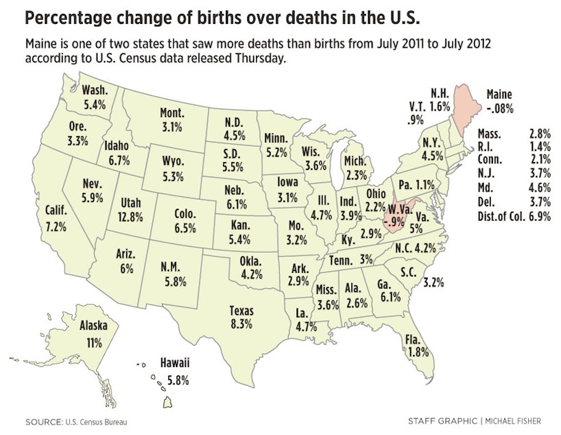 The number of deaths in Maine is expected to be greater than the number of births for the second year in a row, according to new U.S. Census data released Thursday.