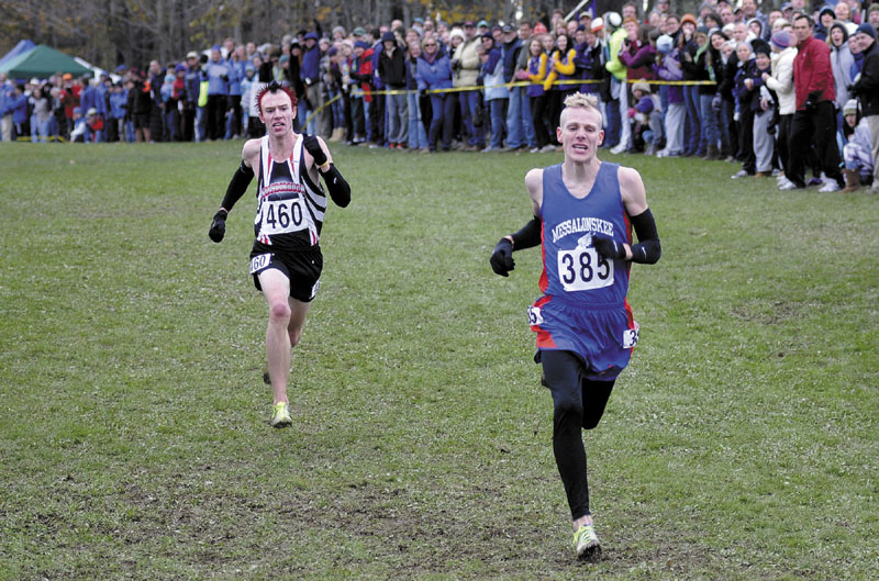 CUMBERLAND — Scarborough’s Nick Morris nipped Messalonskee’s Harlow Ladd by two one hundredths of a second to win the Class A title in Cumberland on Saturday.