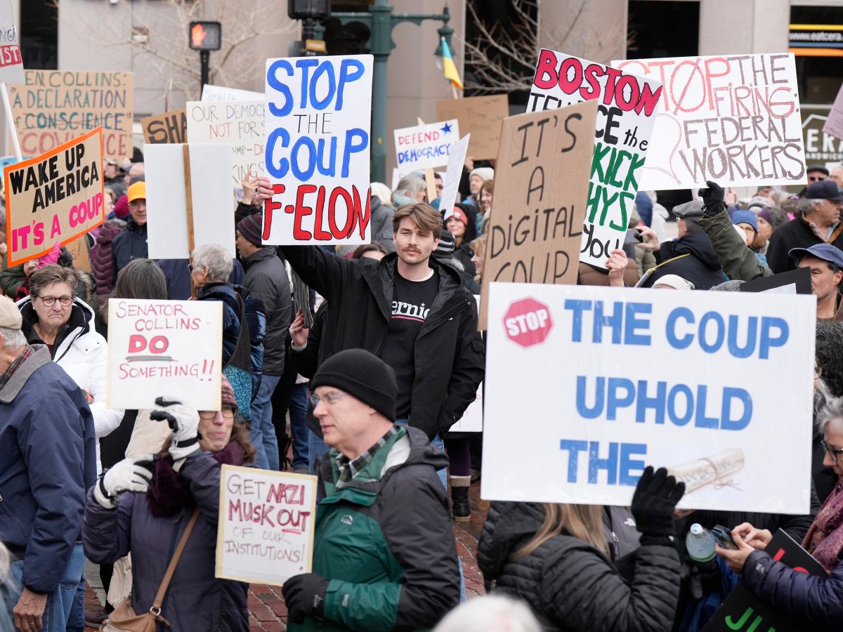 Emotions high at multiple city protests over Trump, Mills, DOGE and transgender athletes
