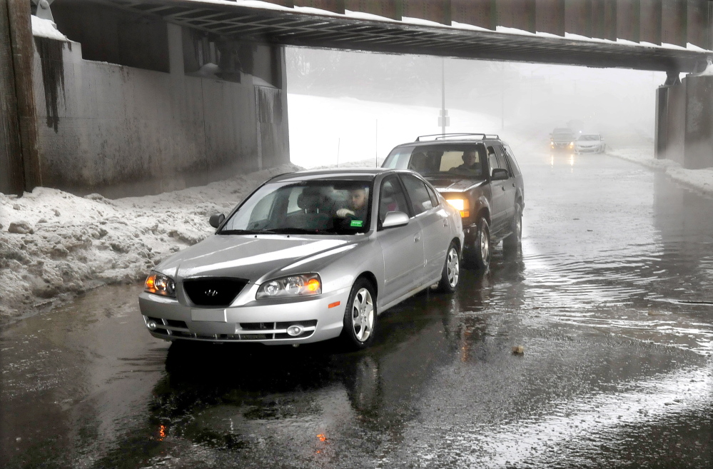 Clogged storm drains flood roads, and slush makes them slick as temperatures rise and snow melts.
