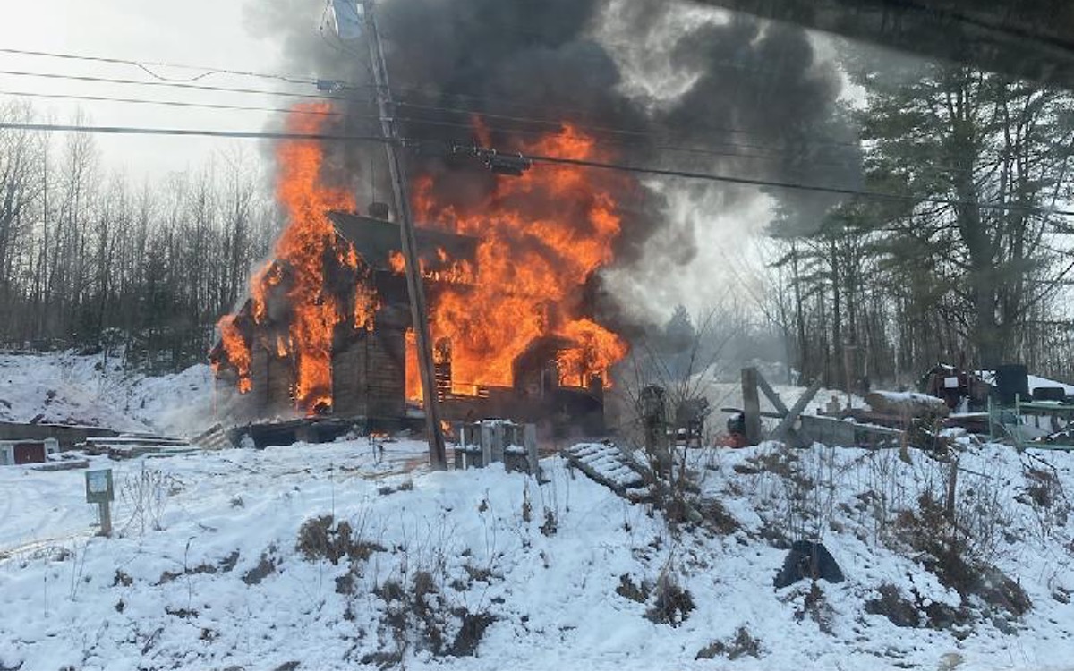 A home on Route 2 in Wilton was destroyed in a blaze while its owner, Ben York, 63, was away. The home contained no pets, and no one was injured.