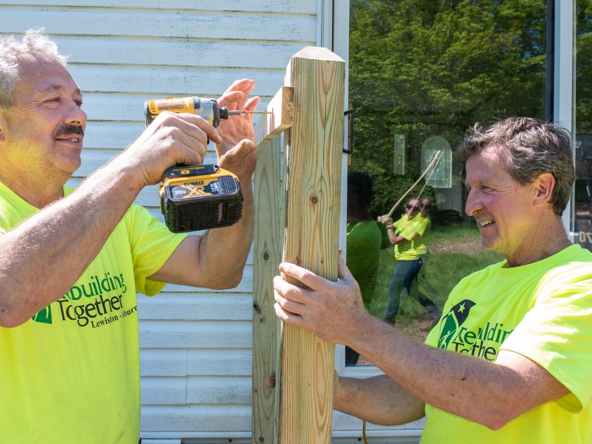 Dozens of volunteers from Rebuilding Together L/A Maine work on four area homes in much need of repairs Saturday.