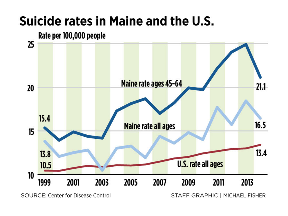 The state number per 100,000 in the 45-64 age group is up 37% since 1999, and some wonder if heavier use of opioids is a factor.