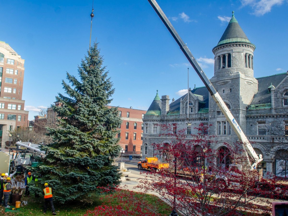 A 43 foot tree, donated by a city resident, was delivered and set up Augusta’s Market Square on Saturday morning. Photos and video by staff photographer Joe Phelan.